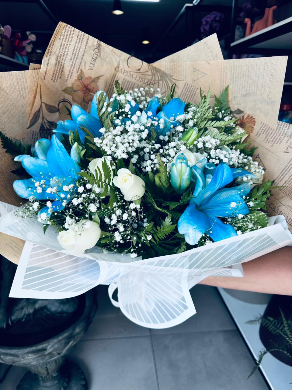 Delicado e sofisticado, este buquê combina 8 rosas brancas — símbolo de pureza, paz e amor sincero — com lírios azuis, que representam serenidade, admiração e harmonia. Juntas, essas flores criam uma composição elegante, ideal para transmitir sentimentos de carinho, gratidão e tranquilidade.