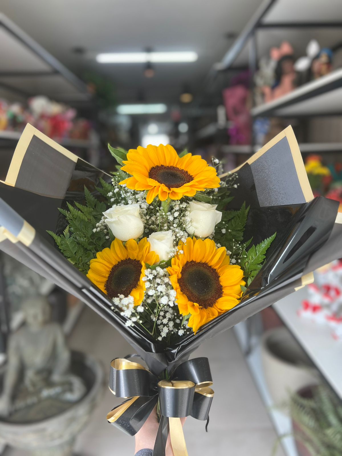 Um lindo e harmonioso ramalhete composto por 3 rosas brancas e 3 girassóis, unindo a pureza e delicadeza das rosas com a energia e alegria dos girassóis. As rosas brancas simbolizam paz, amor sincero e novos começos, enquanto os girassóis representam luz, vitalidade e positividade. Juntos, criam uma combinação perfeita de elegância e calor, ideal para presentear em momentos especiais ou iluminar qualquer ambiente com beleza e significado.