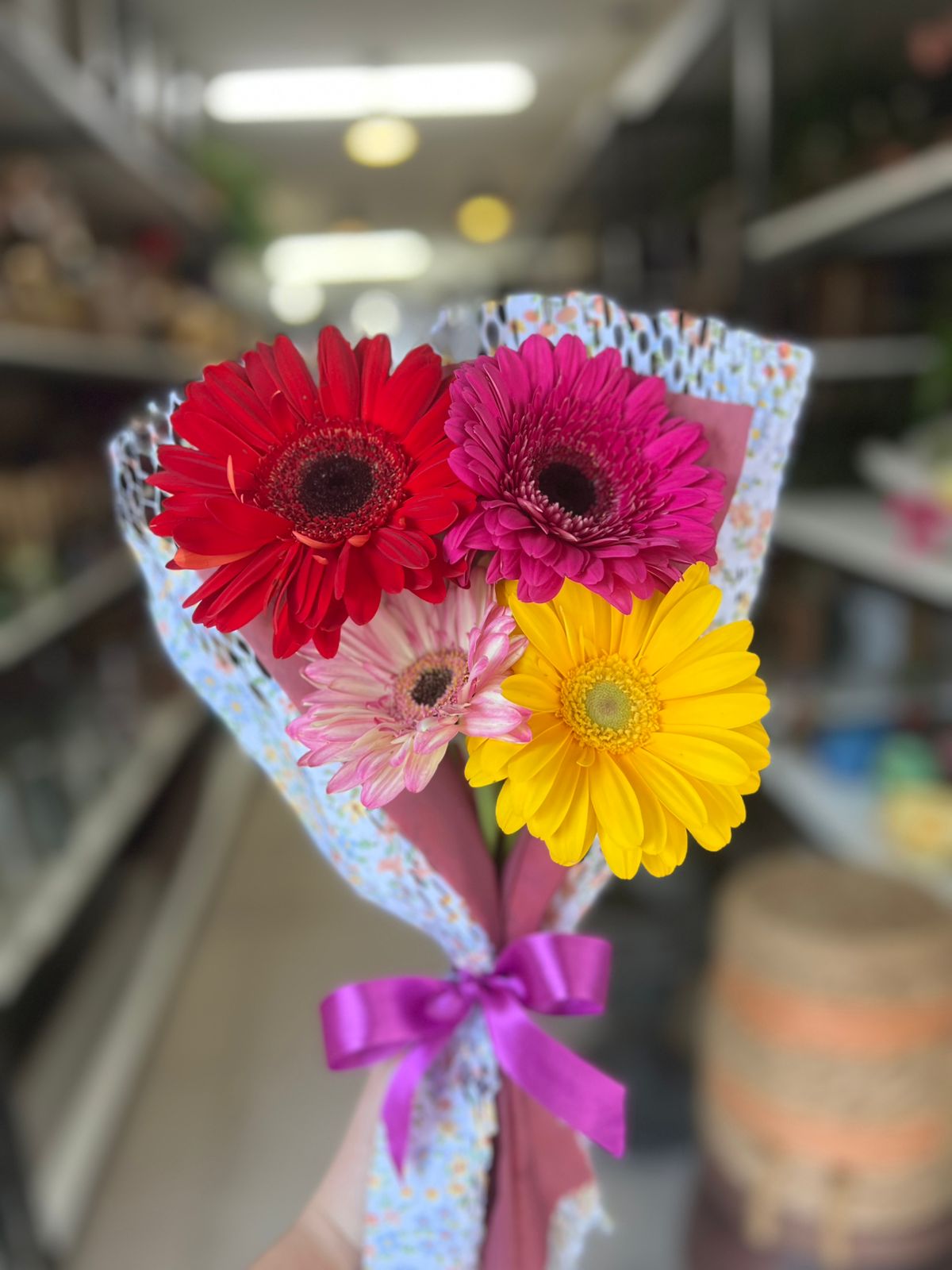 🌸 Composição: 4 gérberas coloridas (cores variadas conforme disponibilidade) com folhagens frescas e acabamento caprichado